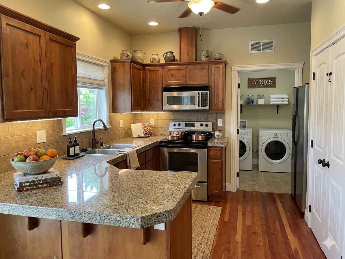 Inside, you’ll find a spacious living room with a cozy fireplace and large front windows that fill the space with natural light. The kitchen is a standout feature, complete with beautiful wood cabinetry, granite countertops, hardwood floors, and stainless-steel appliances, perfect for both everyday living and entertaining.
